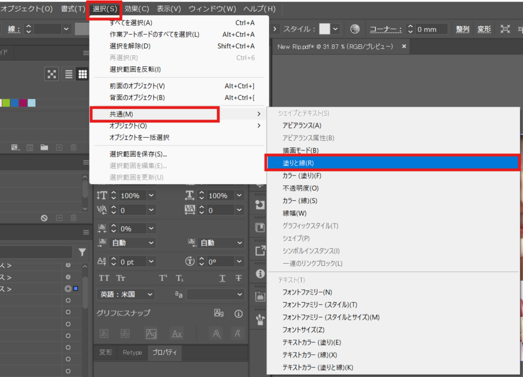 [オブジェクト > 選択 > 塗りと線 ] をクリック